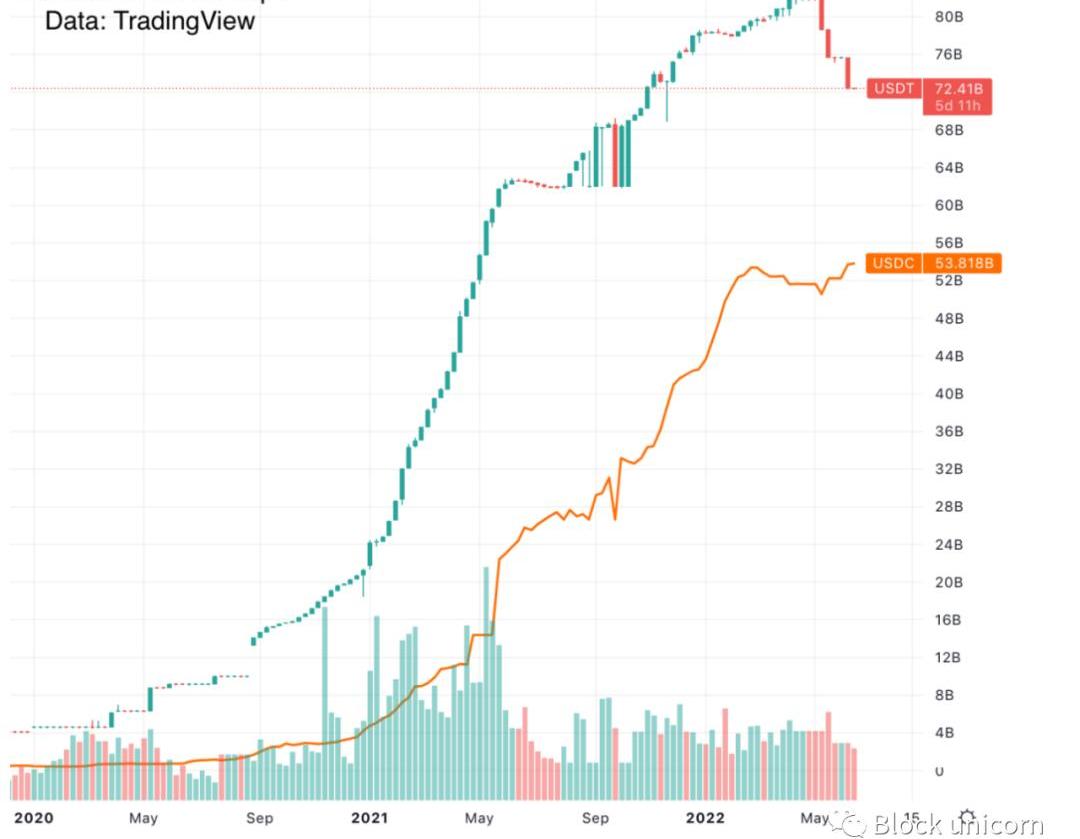 请注意,在2022年5月,在LUNA稳定币崩盘时,大约10B美元的USDT被赎回。其中,大约5B美元是「USDT去风险」,做市商将USDT换成USDC。