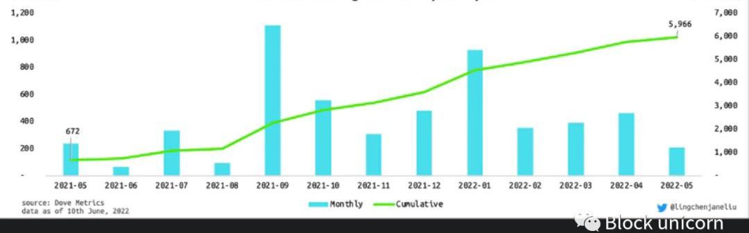 如果只看NFTFi(NFT信贷市场的行业领导者)发放的贷款,2021年贷款规模超过4000万美元,2022年1月至2022年5月的累计贷款规模达到1.55亿美元。2022年5月NFT交易额30亿美元(见图2),NFTFi同月发放3600万美元贷款,NFT信贷市场渗透率略高于1%。