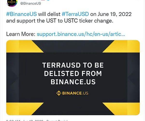 在收到美方集体诉讼通知后,Binance.US在社交媒体上发文表示,将于6月19日下架TerraUSD(UST),同时表态称Binance.US会定期审查所列出的每个数字资产,以确保其继续达到公司预期的高标准。