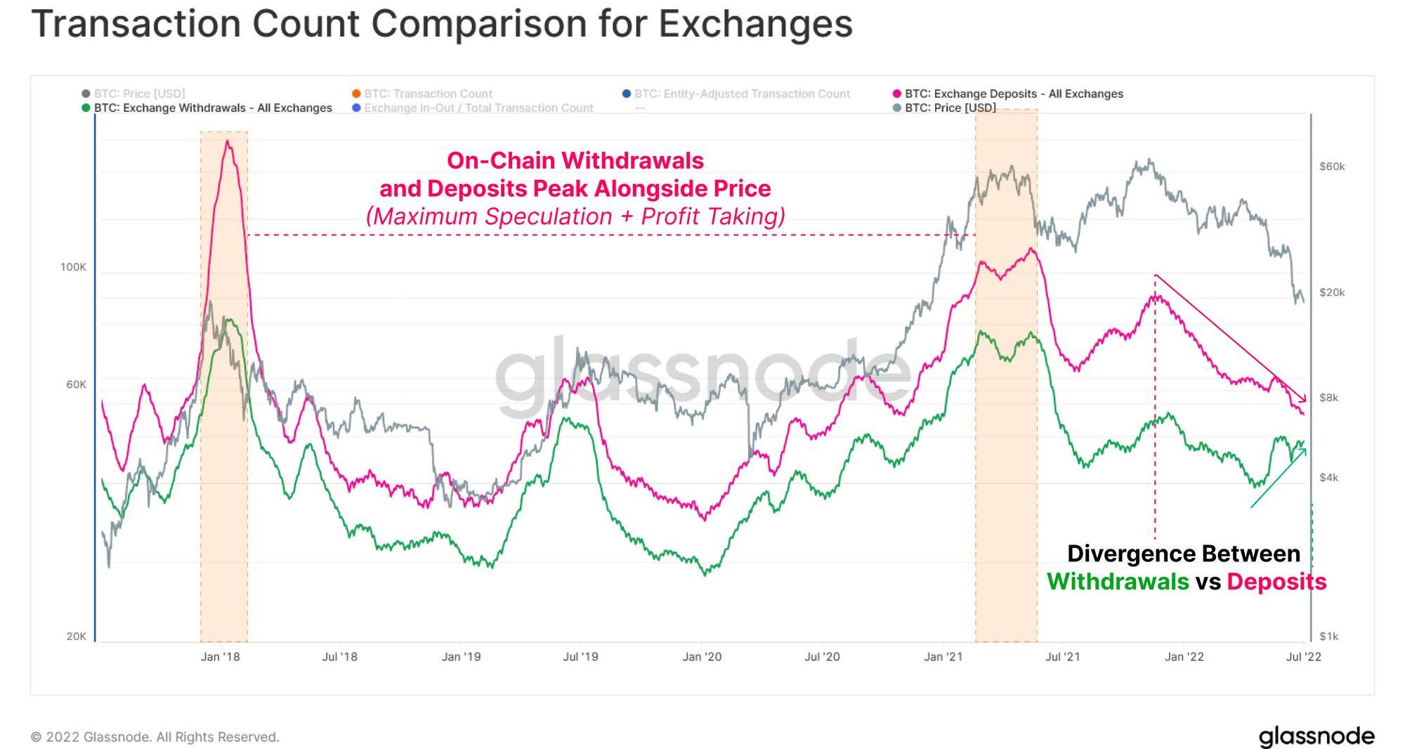 一般而言,存款和取款数量均随价格走势,在牛市顶部达到顶峰,此时投机性需求的流入量最大。相对于存款,取款的数量往往较少。这是由于交易所在一次交易中处理多个客户的提款,而存款则是单独处理。