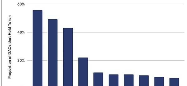 然而,稳定币很少占到链上大部分财物价值。平均而言,85%的DAO的链上财物存储在单一资产中,而在我们研究的DAO中,该资产只有23%是稳定币。