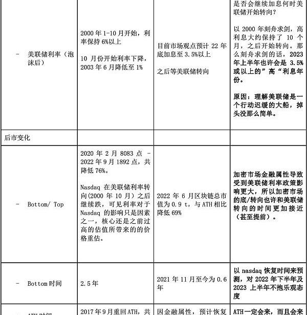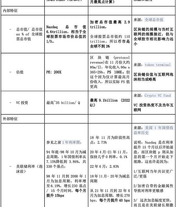 从外部环境来看,两次泡沫破裂都处在一个美联储的加息周期。而因为互联网的金融属性略低,而共识广泛度更高,所以互联网泡沫是在加息15个月之后才被刺破,而区块链则是加息第一个月开始就开始下行。