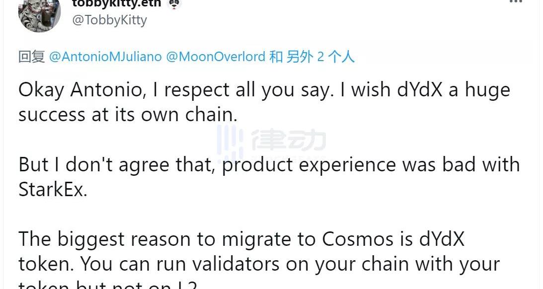 StarkNet联合创始人@TobbyKitty直言,迁移到Cosmos的最大原因是为了让dYdXToken在新链上运行验证节点,锁定协议价值,但在L2上就不行。