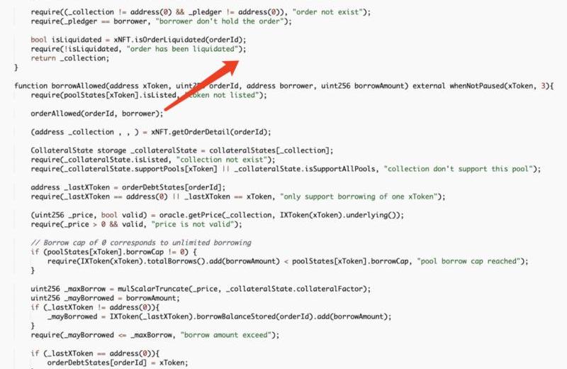 可以看到在borrowAllowed函数会调用orderAllowed函数进行订单相关信息的判断,但是在这两个函数中均没有进行_order.isWithdraw状态的判断。因此攻击者可以利用之前生成的订单来调用XToken的borrow函数来借款,而因为抵押的NFT在之前已经被提出,故攻击者可以不用还款来实现获利。