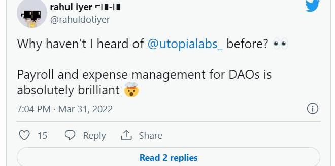 如果还不清楚的话,我们选择了UtopiaLabs,因为该团队反应迅速,符合我们未来的计划,并且有一些最大的DAO正在与他们进行实验。我对这个团队充满了爱,很高兴看到他们继续建立的东西。