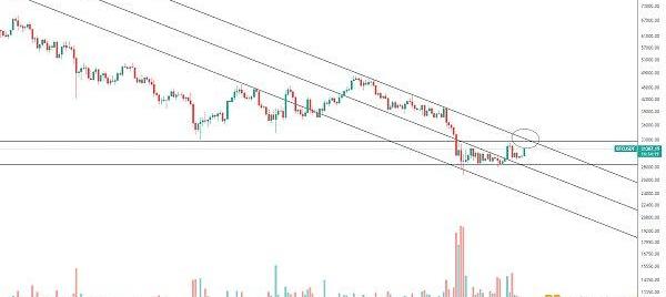 随着BTC一路震荡回落,可以看到图中通道已经转红,2018年熊市后期通道转红后,BTC再次迎来大幅下杀,2014年也是在转红后BTC出现大幅下杀,所以目前还是要注意风险,谨防反弹后再次掉头下杀风险,上方趋势压制35000-37000,和上方周线下降压制线重合,有效突破空头趋势才有望反转,在未有效突破前,可以考虑逢高减仓。