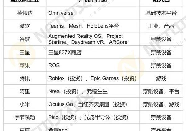 各大互联网头部企业如何抓住这一契机,又如何紧跟时代进程发展,考验它们的智慧。我们通过梳理观察全球各大头部互联网企业在元宇宙的布局和行动,试图分析行动背后的逻辑和思考。通过梳理下列表格可以看出不同的企业在面对新兴的元宇宙潮流面前,作出了不同的选择。