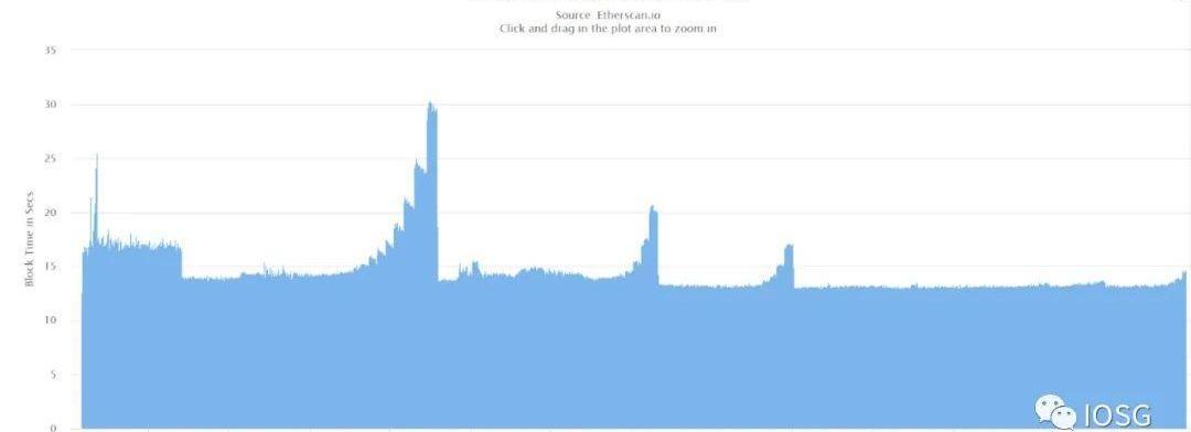 以太坊设计了难度炸弹机制辅助PoW向PoS的切换,难度炸弹启动后会使得PoW网络的挖矿难度指数增长,最终达到冻结。从下图可以看到,以太坊历史上有过三次难度炸弹抬升出块难度的历史。