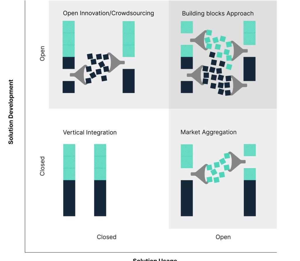 开源项目主要依赖开发人员生态系统进行解决方案开发。然后通过传统的公司所有的渠道(例如Redhat与Linux的关系)对软件进行打包、交付和支持。这在左上象限中显示。