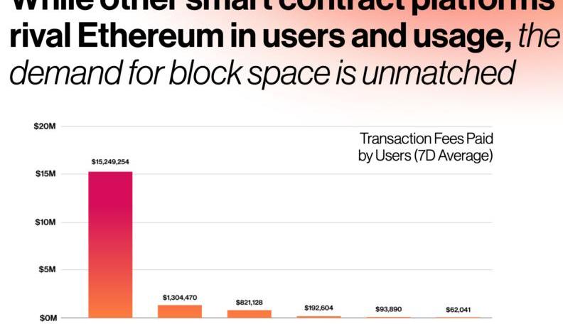 以太坊的领先与它的早期起步和社区的健康有很大关系。就开发者兴趣而言,以太坊拥有最多的构建者,每月有近4000名活跃开发者。18(见幻灯片)。紧随其后的是Solana(接近1000)和比特币(约500)。以太坊压倒性的影响力有助于解释为什么它的用户平均每天愿意支付超过1500万美元的费用来使用区块链——对于这样一个年轻的项目来说,这是很了不起的。