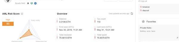 该地址初始资金来自TornadoCash转入的两笔1ETH,总共收到约37ETH,并通过189笔转出洗币,有从Binance提币和入金的交易记录。