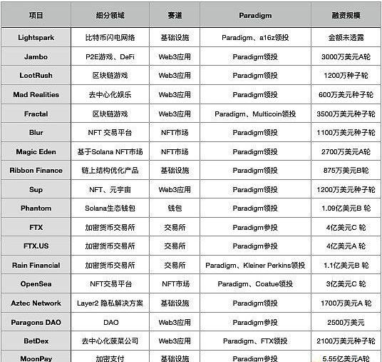 过去半年,Paradigm的投资重心着重于web3应用,集中在链游:Jambo、LootRush、MadRealities、Fractal、Sup等和NFT市场如OpenSea以及Blur;另外区块链基础设施也是Paradigm重点关注的方面,包括最新投资的比特币闪电网络Lightspark、AztecNetwork、Starkware、加密支付平台Moonpay等。