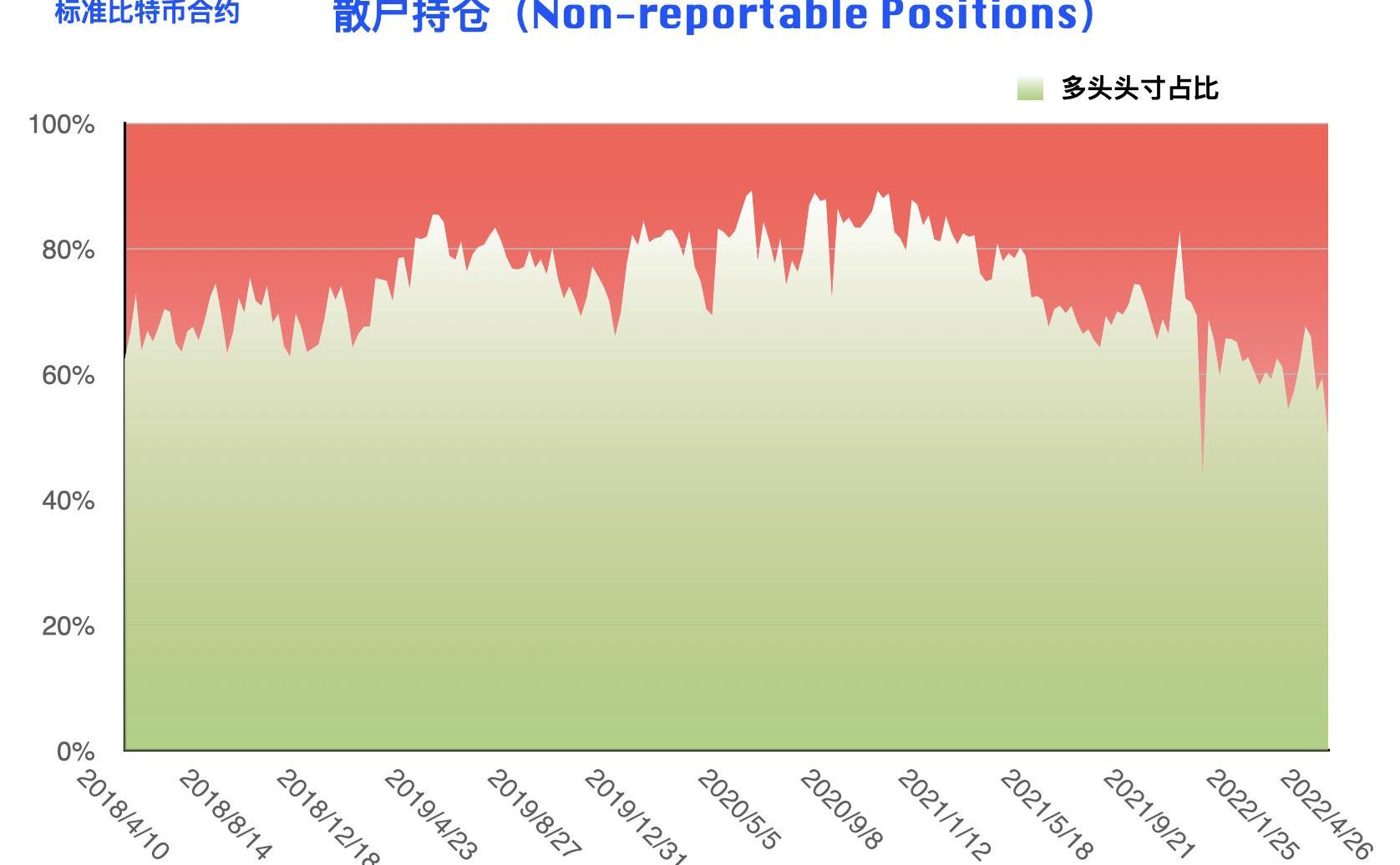 散户多头头寸自?1155?下降至?942,空头头寸自?786?上升至?928,散户在最新统计周期内进行了净空调仓,也是最新统计周期内唯一一类进行了清晰单边调仓的账户,而且散户的多空持仓已经几乎持平,多单持仓占比降至去年?11?月底以来新低。行情的持续下跌对于散户的情绪造成了「重创」。