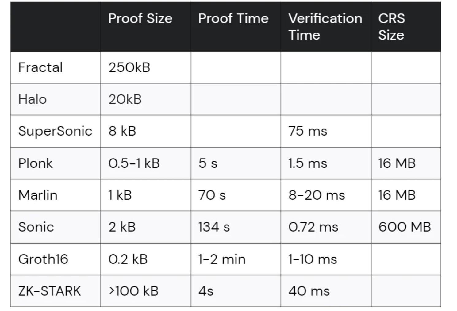 透明设置:信任设置阶段设置一个CRS。如果CRS泄露,ZK证明系统不会受到伤害。Fractal、Halo、SuperSonic和ZK-STARK使用这种方法。这种方法的问题是证明的大小可能以kB为单位。这对于区块链领域来说太大了。