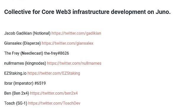 Juno由Cosmos生态系统中的开发人员、验证者和委托人推动开发,整个开发团队以相对松散的模式进行组织。根据白皮书,除个人贡献者外,核心开发团队为Core-1以及Core-2,目前社区主要由Core-1团队运营。