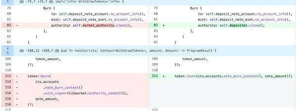 这个market_authority也是一个PDA账号。也就是说合约通过自身的调用就可以销毁用户的LP代币。那么对于恶意用户来说,要发起攻击就很简单了,只要简单地把deposit_note_account账号设置为想要窃取的目标账号,withdraw_account账号设置为自己的收款账号,就可以销毁他的LP,并把他的存款本金提现到自己的账号上。