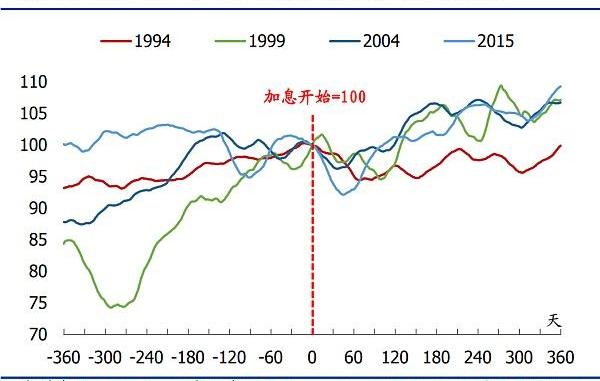 若单独观察美国股指表现的话,我们可以看到,它们在80年代的两轮加息以及2015-2018加息周期中表现较好,虽然在1994-1994年期间表现为负,但也只是小幅度的负回报。其他两轮周期中,表现基本持平。