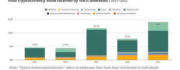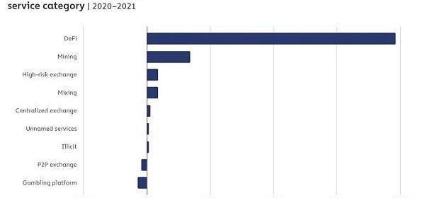 目前,根据权威区块链数据分析咨询公司Chainalysis于近期发布的《2022年加密犯罪报告-原始数据和基于加密货币的犯罪研究》,DeFi项目在2021年一整年中接收到的非法资金与上一年度相比显著增长,占所有被监测到的非法资金的17%,这一数据在2020年仅为2%,同比增长约1900%。