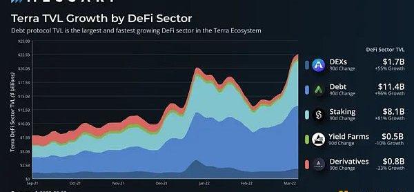 TVL的大部分增长来自债务协议,因为Anchor在30天内TVL增长了50亿美元。这些存款在很大程度上是为了追逐Anchor20%的收益率,因为债务相对于存款仅增长了三分之一。