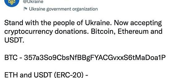 2月26日,乌克兰政府在推特公布官方受捐地址,呼吁以BTC、ETH、USDT形式的加密捐款援助乌克兰。随后,乌克兰政府又公布了DOGE、波卡等虚拟货币受捐地址。