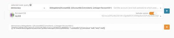 发送委托交易后,你可以通过导航到“ChainState”选项卡并选择“democracy”和“delegate”选项来验证它是否通过了。你将看到类似于下面的输出,显示你已将投票权委托给的地址。