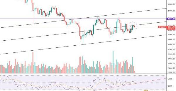 短期日线在前期双底上行通道中轨线一带遇阻,这一带突破后面才有望测试42000一带压力,目前RSI仍在上行趋势线上,不破后面就有机会再次上攻,不过大方向偏空,反弹仍以逢高减仓应对,压力42000-42500,强压44500-46000。