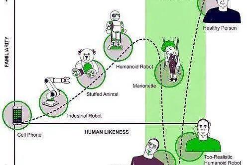 恐怖谷理论是一个关于人类对机器人和非人类物体的感觉的假设,它在1970年由日本机器人专家森昌弘提出,由于机器人与人类在外表﹑动作上都相当相似,所以人类亦会对机器人产生正面的情感,直至到了一个特定程度,他们的反应便会突然变得极之反感,哪怕机器人与人类有一点点的差别,都会显得非常显眼刺目,让整个机器人显得非常僵硬恐怖,让人有面对行尸走肉的感觉。人形玩具或机器人的仿真度越高人们越有好感,但在相似度临近100%前,这种好感度会突然降低,越像人反而越反感恐惧,好感度降至谷底,这被称之为恐怖谷。可是,当机器人的外表和动作和人类的相似度继续上升的时候,人类对他们的情感反应亦会变回正面,贴近人类与人类之间的移情作用。
