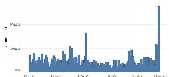在被SWIFT除名后,超过1000BTC的数量激增,卢布与USDT之间的计价交易量达到2940万美元,为9个月以来最高水平,一周内增长了两倍多。另外,俄罗斯交易所的BTC出现溢价,3月1日BTC单价达到$61346/枚,溢价达到1.8万美元,有明显的法币资金出逃迹象。