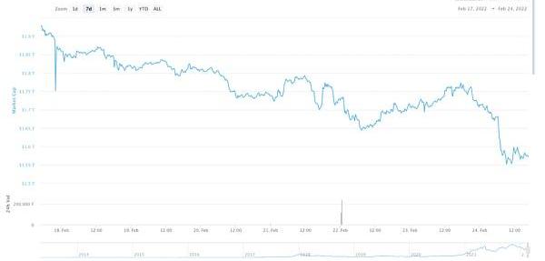 危机爆发,俄罗斯进攻乌克兰对全球经济产生了巨大影响。传统行业和加密货币行业都受到了新战争阴云的影响。下图显示了过去一周加密货币的下跌趋势。