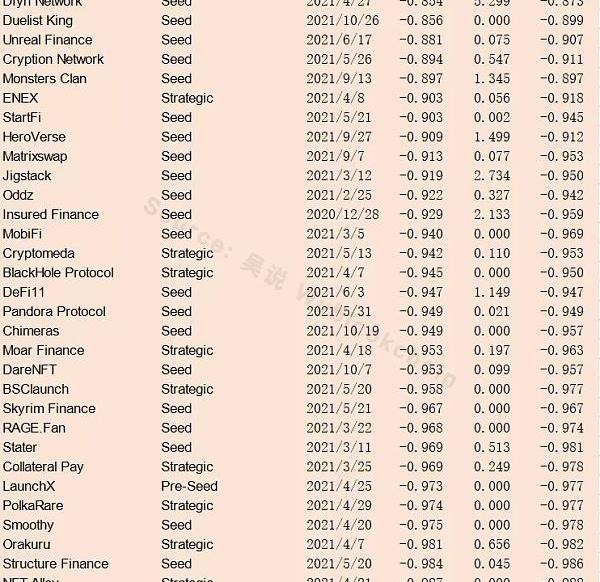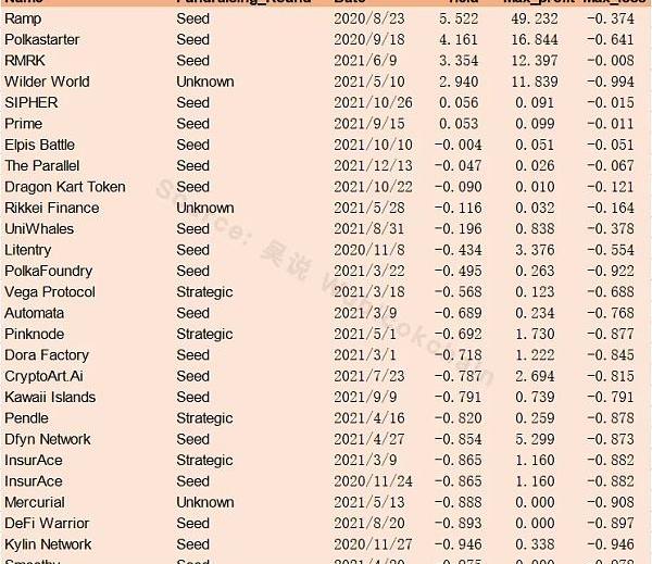 非常重要的一点是,项目token的损益不是从发行日开始算起,而是从融资信息公布日开始算。以AxieInfinity为例,该项目发行至今上涨了超过300倍,a16z与Paradigm等一众知名VC都参与了其B轮融资,但如果按发行以来的收益率计算就会高估他们的实际收益率。事实上,B轮融资是去年10月公布的,而Axie的暴涨发生在去年夏天,如果只计算10月以来收益率,那么真实数字为-50%。