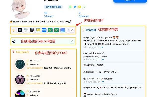 RSS3仿造Web2社交平台常有的个人页面,使用者可以用Web3Pass自由设定RNS域名,在上头编辑个人档案,呈现个人在去中心化网络上的活动,如NFT收藏等。