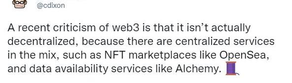 律动BlockBeats消息,1月24日,a16z合伙人ChrisDixon在社交媒体上发文表示,市场上对Web3存在不少批评是因为许多人认为Web3其实并不是去中心化的,因为许多Web3应用混合了中心化服务,比如OpenseaNFT市场,以及Alchemy数据可用性服务。但是,这种批评其实基于了对「去中心化」的错误理解。