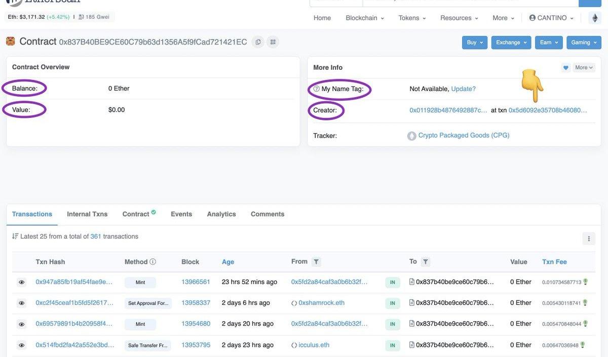 3.「Creator」:这里显示创建合约的钱包,以及原始交易的链接。让我们点击它。