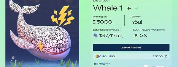 为了表达鲸鱼在海洋生态系统中的上述关键作用,Diatom创建了50个Whalez?NFT的有限集合。每个Token都有一个整洁的独特艺术品,但也代表了其去除塑料的公斤数。通过这种方式,投资者可以清楚地了解他们购买NFT对更大利益的影响。