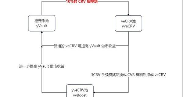 Yearn把剩下的10%CRV奖励质押成veCRV,将其专门做成一个新的资金池yveCRVVault,接受新的CRV质押,由于多了这10%的CRV奖励,所以在yveCRVVault质押CRV的收益会高于直接在Curve内质押,对用户来说更具吸引力。这时候,yveCRVVault新吸引积累的veCRV权重能够进一步加速提高稳定币池的做市收益,获得更多的CRV奖励,同时Yearn还把yveCRVVault的手续费奖励3CRV统一兑换成CRV复利质押成veCRV,这部分单独再做一个yvBoostVault,继续加速稳定币yVault挖矿,从而形成飞轮效应。