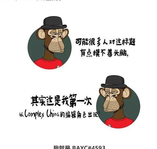 2021年12月17日,一篇名为《Nike、Adidas、库里和我》的文章在潮流媒体Complex中文的公众号上发布,作者名为:BAYC#4593。这支存在于虚拟世界的形象正式作为编辑出现在了众人的视野,因为有嘻哈背景,熟知音乐和潮流内容,让他成为了第一个找到工作的无聊猿猴。