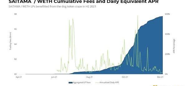 2021年10月,流动性提供者的费用开始飙升,并从12月开始逐渐减少。然而,夏季部分时间收到的年化每日APR流动性提供者几乎达到了600%。低交易量和高APR的结合意味着流动性提供者的总数并不多,这可能证实了SAITAMA直到夏末才得到加密投资者的认可。