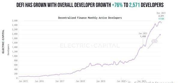 DeFi的开发生态增长了76%,与Web3的整体增长相一致.每个月有500名新的开发者向DeFi项目提交代码.