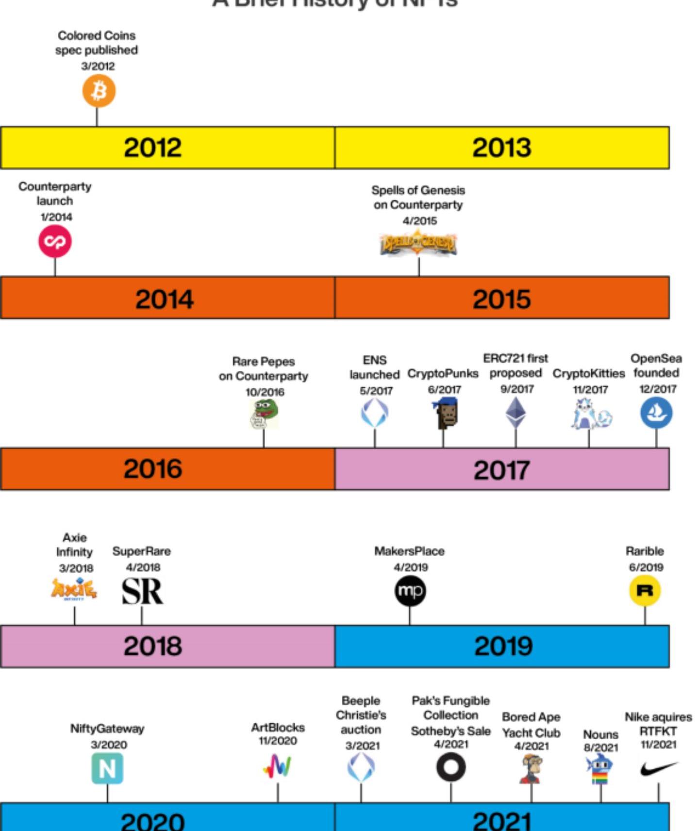 在2020年底,像Pak和Beeple等蓝筹艺术家都在SuperRare和NiftyGateway上投放了引人注目的作品。2021年,PFP爆发式增长(BoredApes、Nouns、Toadz),苏富比和佳士得等传统拍卖行以及阿迪达斯和耐克等主流消费品牌也大举参与了进来。