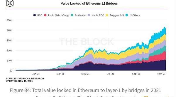 评估L1生态系统之间移动的最佳方法不是只看包装资产的增长,而是看连接各个生态系统的跨链桥所锁定的总价值。特别是2021年,大量资金从以太坊转移到其他L1链,因为DeFi参与者寻求投资其他链上出现的早期协议,以及利用在更广泛的DeFi领域中可能发现的有吸引力的收益率。