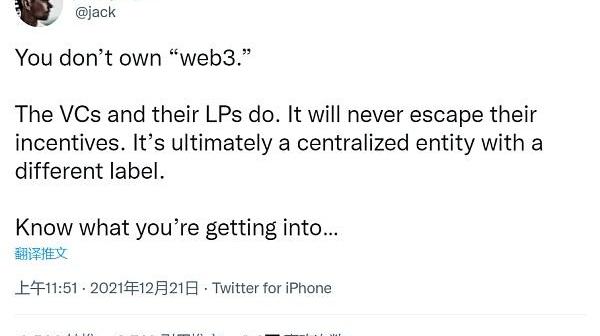 他在周二发布的推文中这样描述Web3.0领域的去中心化,这也是这场论战开始的地方: