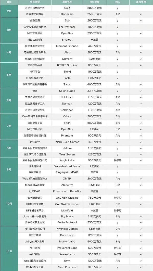 综合看a16z的投资风格,对赛道龙头级项目尤其青睐,并且大多领投。在2020年8月,DeFi刚爆发时,a16z迅速投资了头部DEX项目Uniswap,年底又投资了NFT头部公司DapperLabs以及Layer2头部项目Optimism。而在今年Solana生态迅速爆发后,此前错过的a16z旋即领投了SolanaLabs的3.14亿美元融资。