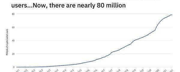 我们先来看用户规模,三年前,估计有加密钱包用户数量为3100万,今天,这一数字逼近8000万。?