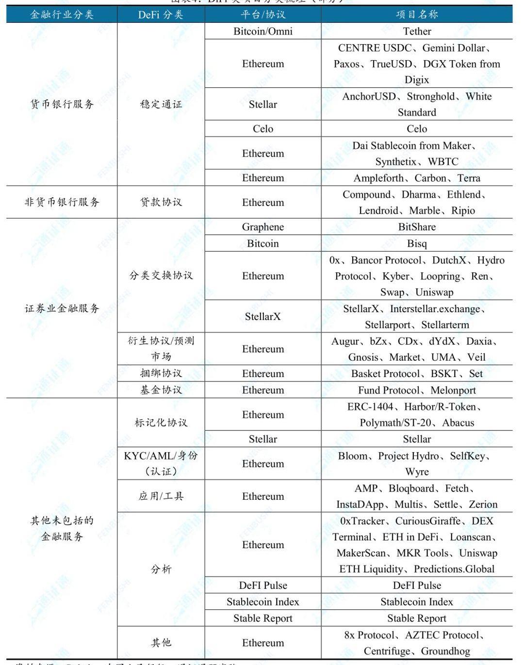 DeFi概念产生以来,目前符合条件的区块链项目已有上千个。据Github,DeFi可分为分散交换协议、稳定通证、贷款协议、衍生协议/预测市场等。据金融业的划分标准,可将DeFi重新分为:货币银行服务、非货币银行服务、证券业金融服务,其他未包括的金融服务。显而易见的是,现阶段DeFi多集中于发行通证、融资、交易和相关金融工具类领域。