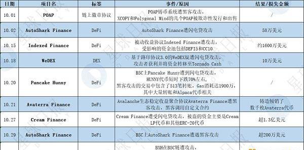 10月15日,被动收益协议IndexedFinance遭到攻击,受影响的资金池包括DEFI5和CC10。官方在Discord中表示,本次攻击造成的损失约1600万美元。