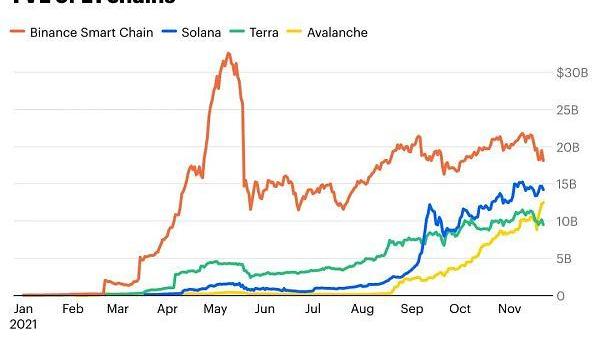 在过去10个月里,新的第1层网络陆续上线,在同一时期内,这些网络的总价值从0美元飙升至750亿美元左右。该领域目前由Solana、Avalanche、Terra和币安智能链(BinanceSmartChain)领导,每一个都拥有不断增长的生态系统,价值超过100亿美元。
