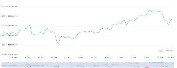 DeFi数据 1.DeFi总市值:1551.53亿美元 DeFi总市值数据来源:Coingecko2.过去24小时去中心化交易所的交易量:37.