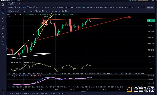 这预示着在接下来的一段时间,美股或因经济刺激计划的逐渐落地开启新一轮牛市,不断出现新高。所以比特币在未来一段时间个人认为大概率随动美股趋势,仍应以多头方向为主要获利方向。昨夜比特币在4小时级别冲击前高15985未果后形成该时间级别位于15800附近的三次波峰,这样新的上边线为水平的收敛出现。K线西游战法对上边线为水平的收敛给出的解释是,这是一个很容易在收敛近交点发生回落的结构。直到行情中能形成窄收敛三角结构后才容易发生突破。因此这里虽然是多头趋势,但应等待比特币回落至15000美金下方才能降低多头介入风险。