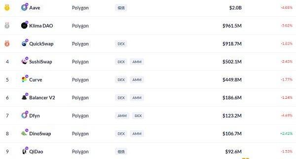 Polygon链上DeFi锁定资产前十排名及锁仓量,数据来源:Debank