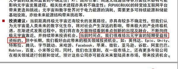 中信证券称:“当前时间点,我们很难给出元宇宙的短期受益投资标的,但中长期,我们看好由此带来的相关领域的投资机会,如:英伟达、Epic、Unity、特斯拉、腾讯、字节跳动、米哈游、Facebook、苹果、微软、亚马逊、谷歌、阿里巴巴、Roblox、百度、小米等。”